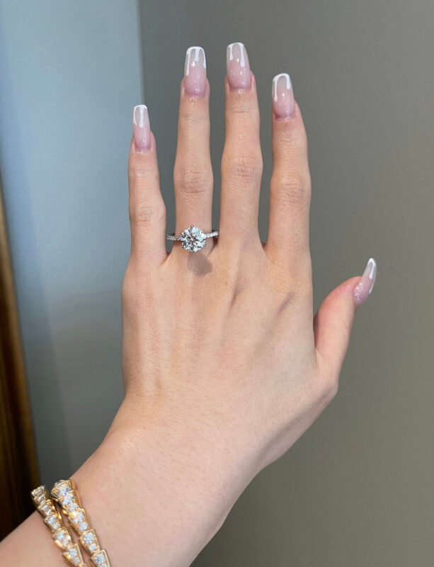 This 3 ct round cut moissanite ring features a classic prong setting, radiating unmatched brilliance—perfect for a timeless and unforgettable engagement.