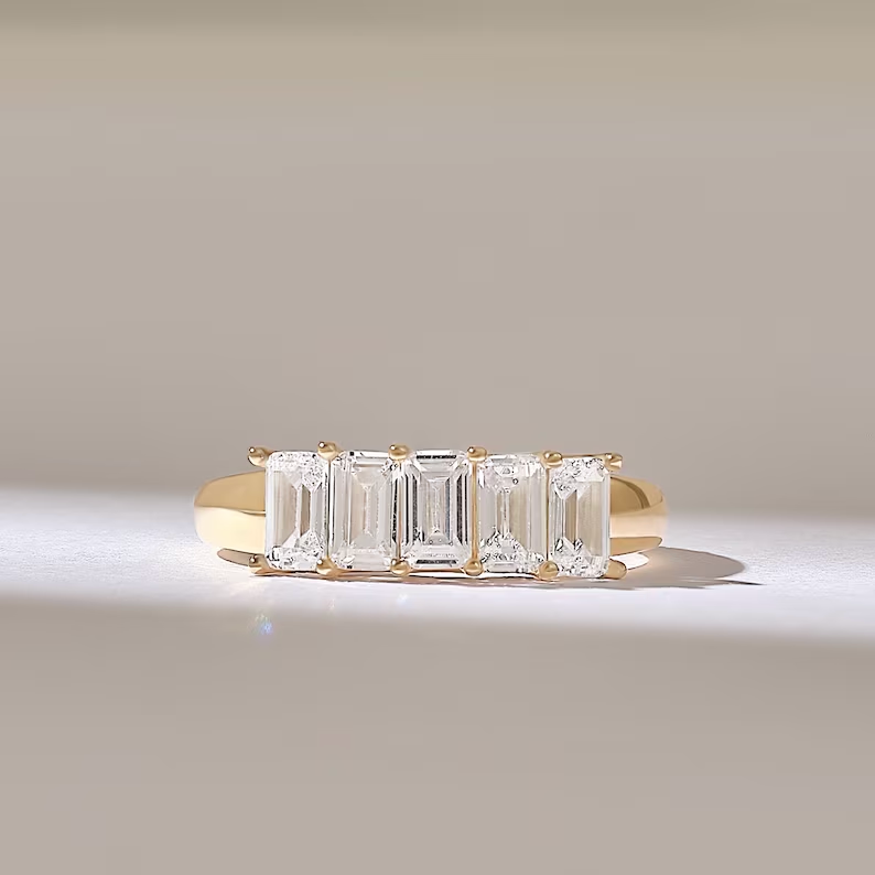Emerald Cut Natural Diamond Wedding Ring: Dainty 5 Stone Band for Women