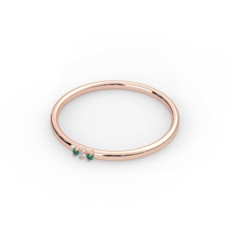 Delicate and timeless, the 14K Solid Gold 1.2 MM Natural Emerald and Diamond Ring is the perfect blend of elegance and subtle luxury. Crafted from solid 14K gold, this exquisite ring features a thin band adorned with a 1.2MM natural emerald, representing May’s birthstone, known for its vibrant green hue and symbolism of renewal and prosperity.