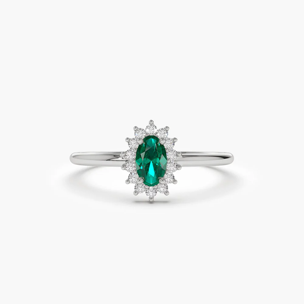 - Setting: Halo design with sparkling moissanite diamonds surrounding the emerald