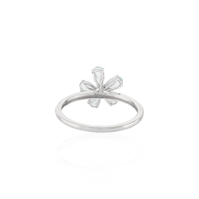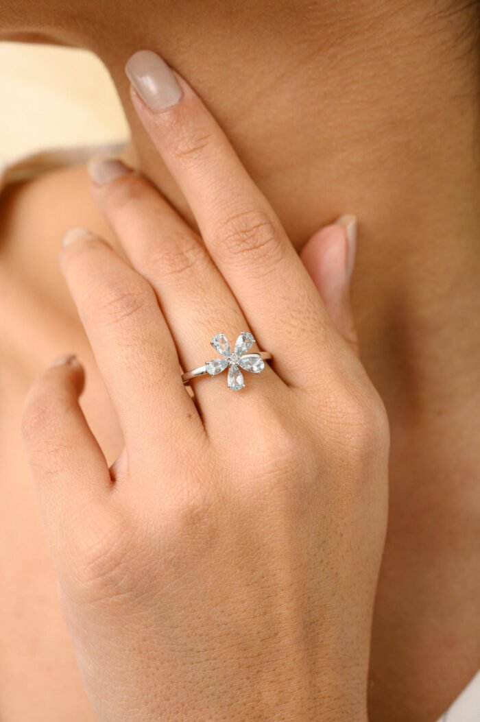 The intricate floral design is further enhanced by a single diamond accent, weighing 0.04 carats, nestled amidst the aquamarine petals. This subtle touch of sparkle adds a hint of luxury and sophistication, elevating the ring’s overall charm.