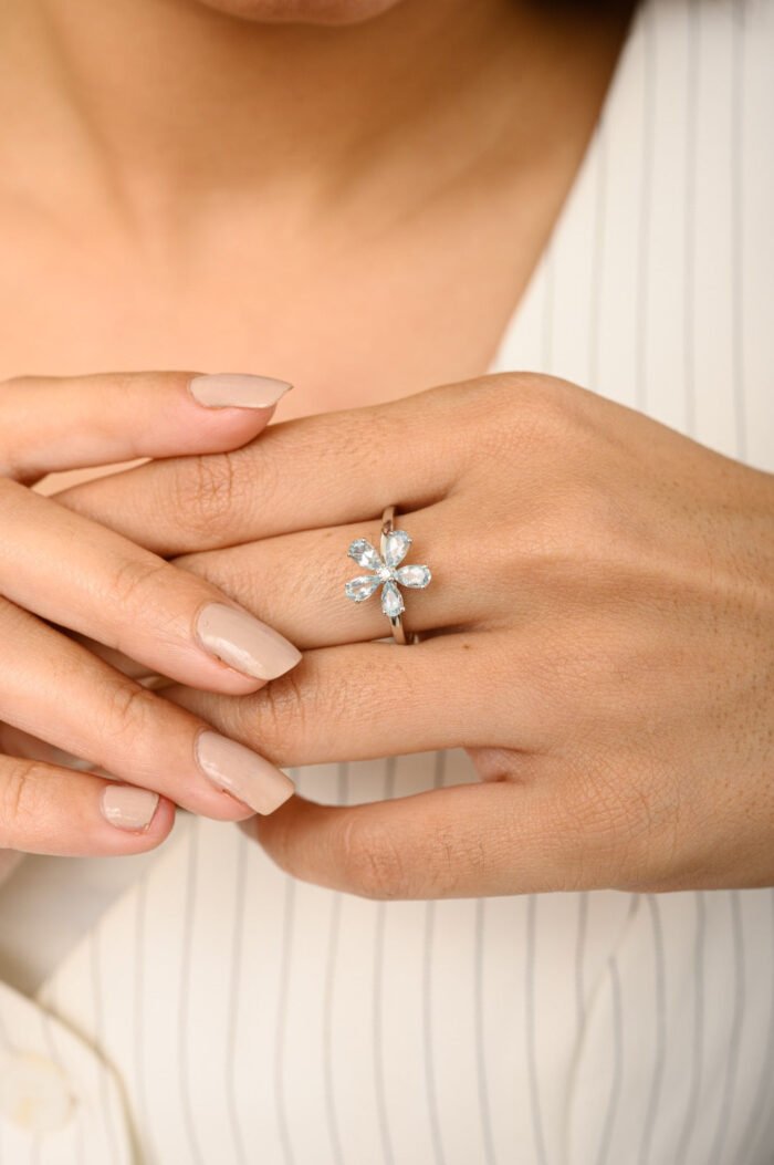 Discover the enchanting allure of our 14K Solid Gold Aquamarine Dainty Floral Ring, a captivating piece that exudes timeless elegance and natural beauty. Crafted from high-quality 14K solid white gold, this ring features a delicate floral motif adorned with five exquisite aquamarine gemstones, totaling 0.86 carats. Each aquamarine gemstone is carefully selected for its soft blue hue and clarity, creating a harmonious blend of color reminiscent of blooming flowers.