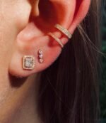 This dainty adornment features a lovely combination of 10 baguette diamonds measuring a total of 0.10 ct, interspersed with 8 brilliant diamonds that measure each 0.04 ct in weight, along with yet an impressive 44 accompanying diamonds that measure 0.11 ct to truly add sparkle to this dazzle. In terms of cuts, diamond, this provides great sparkle in all directions: therefore, perfect earrings for every day to that special day.