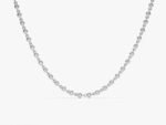 The round diamonds used are brilliant, each in a sleek bezel setting, which emphasizes the natural brilliance of the stone but, at the same time, provides a secure and fashionable frame. This kind of setting maximizes the sparkle of the diamond while providing a modern, streamlined look to add some sophistication to the classic tennis necklace design.