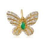 Whimsical 14K solid gold butterfly pendant with marquise emeralds and lab-grown diamonds—crafted for vibrant charm and ethical sparkle.
