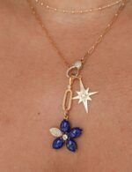 The 14K Solid Gold Diamond Lapis Flower Pendant is an exquisite blend of artistry and luxury, designed to captivate and enchant. This remarkable piece centers around a stunning 58.37-carat lapis lazuli, renowned for its deep, celestial blue hue speckled with gold-like flecks. The lapis lazuli is meticulously carved into a delicate flower shape, symbolizing beauty, growth, and nature’s elegance.