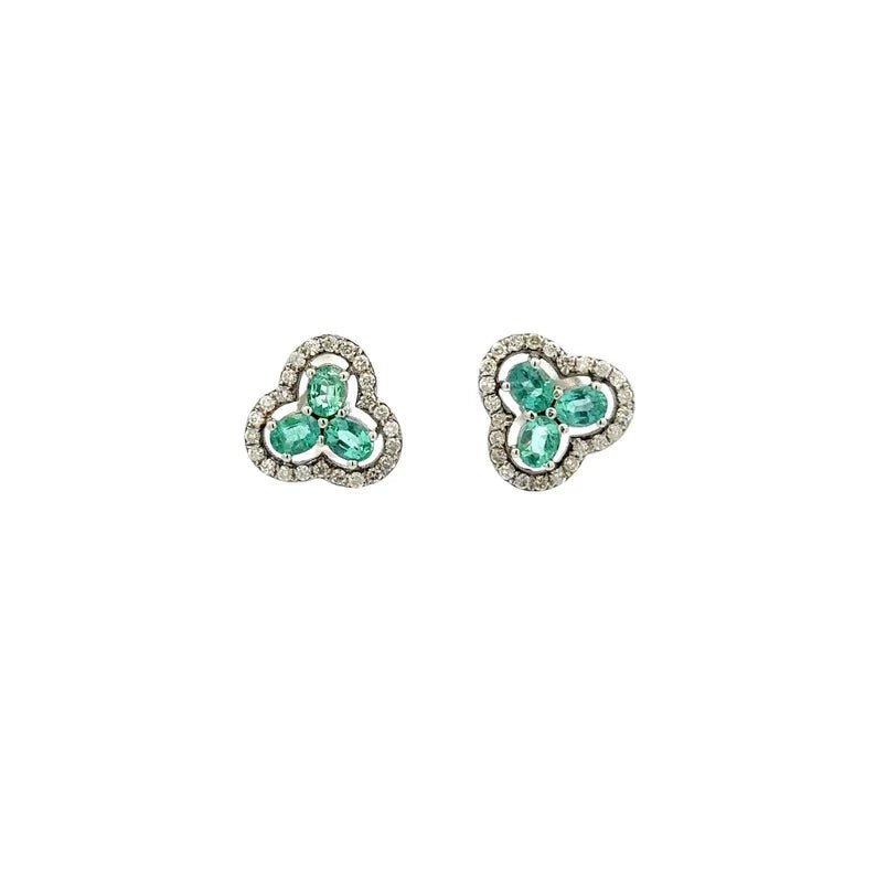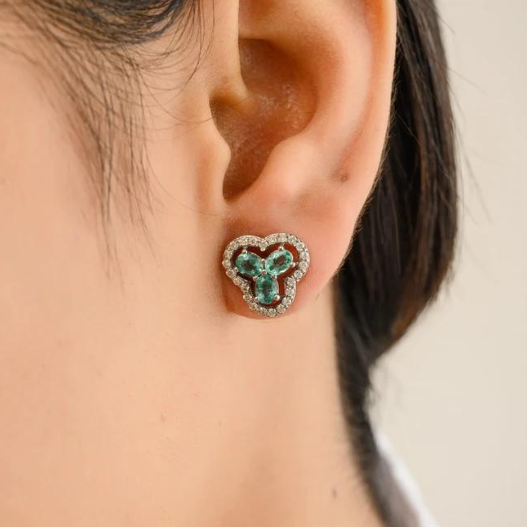 Elegant 14K solid gold stud earrings featuring trio emeralds surrounded by a sparkling diamond halo—perfect for timeless sophistication.