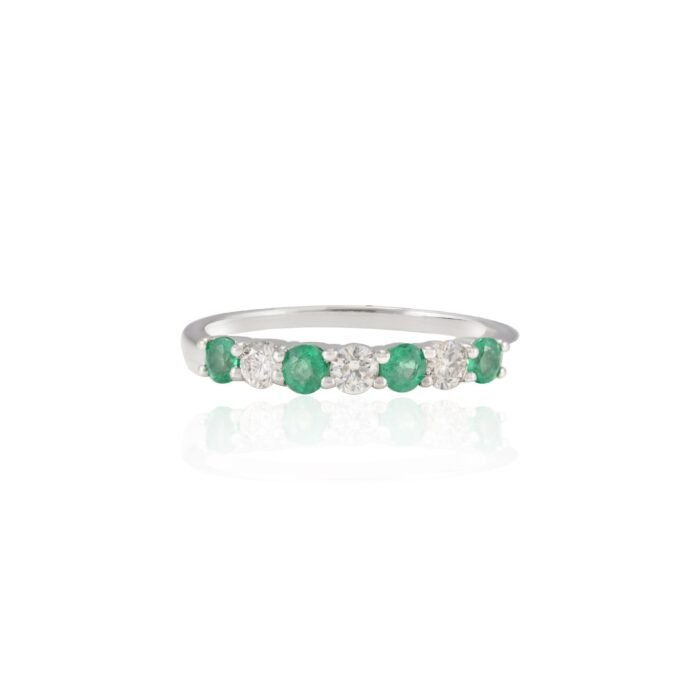 Weighing 1.779 grams, this half eternity band offers a lightweight yet luxurious feel, making it ideal for everyday wear or special occasions. The shank, measuring 1.4 mm in width, provides a delicate and refined appearance that sits gracefully on the finger. The elegant design ensures that the emeralds and diamonds remain the focal points, allowing their beauty to shine through.