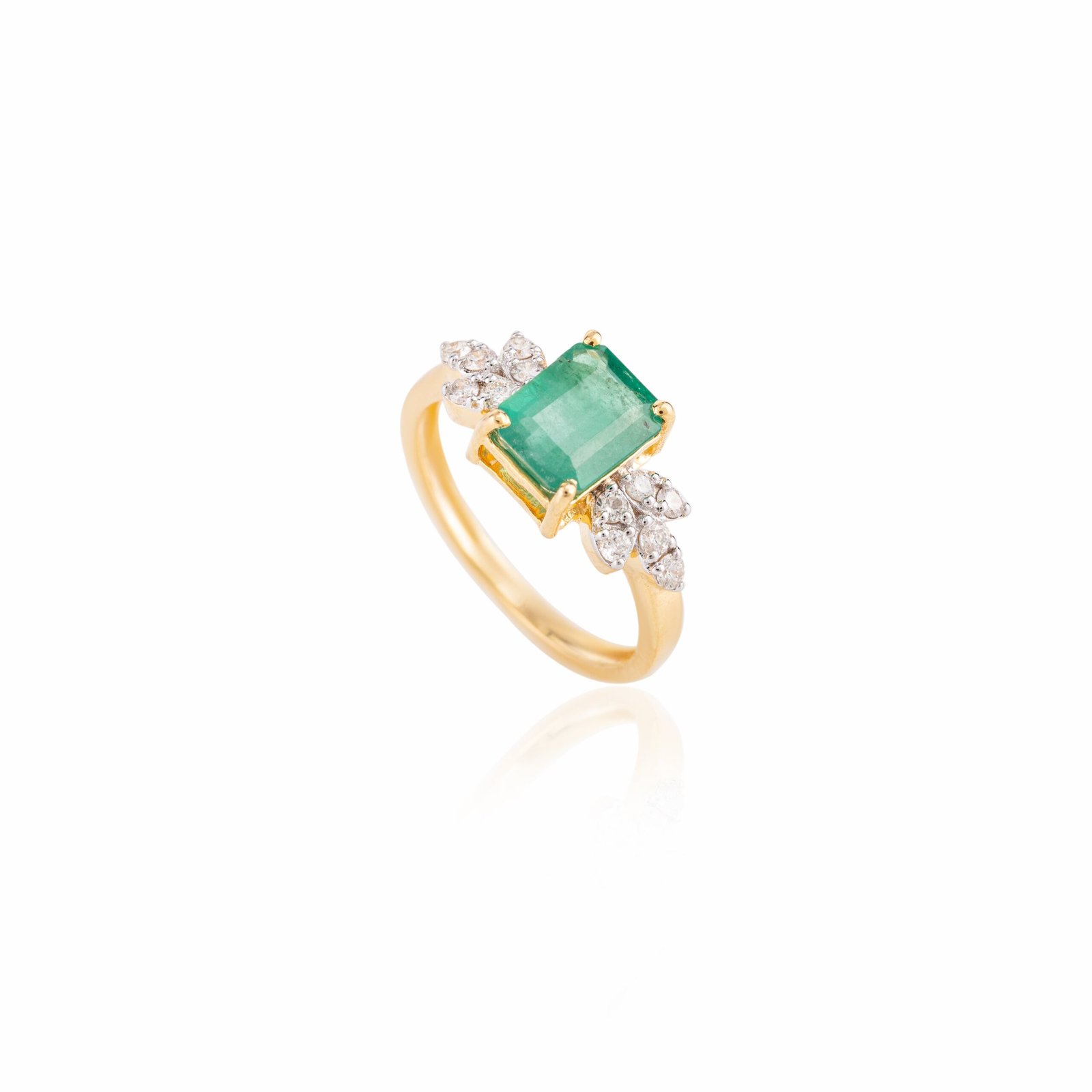 Accentuating the emerald are dazzling diamonds, totaling 0.25 carats. Each diamond, measuring 1.75 mm, is meticulously set to enhance their natural brilliance and add a touch of sparkle to the ring. The combination of the vibrant emerald and the sparkling diamonds creates a stunning contrast that exudes sophistication and charm.