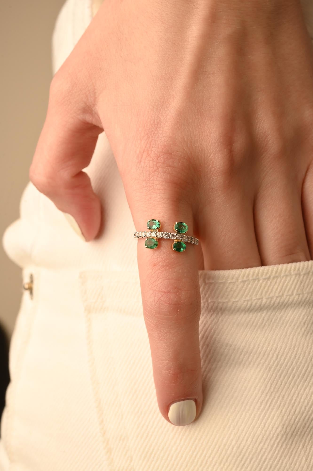 At the heart of this ring are four carefully selected oval-shaped emeralds, each measuring 4 x 3 mm. These emeralds, with a total weight of 0.68 carats, are prong-set to maximize their exposure to light, enhancing their natural color and brilliance. The oval shape of the emeralds adds a touch of classic elegance to the ring, making it a versatile piece that can be worn for both special occasions and everyday luxury.