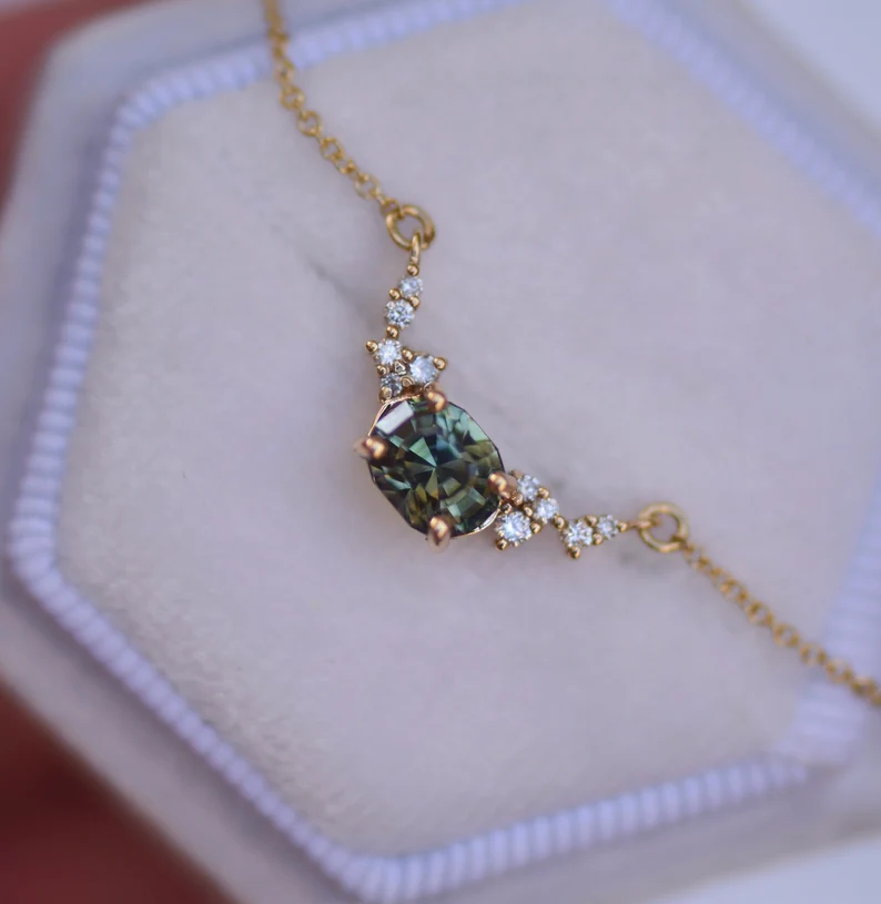 Delicate, vibrant, and one-of-a-kind, the 14K Solid Gold Green Montana Sapphire Cluster Necklace brings the wild beauty of nature to fine jewelry. This captivating piece features a hand-arranged cluster of natural green Montana sapphires, known for their earthy tones ranging from soft sage to rich forest green. Each stone is ethically sourced from Montana, USA, and naturally displays slight variations in hue — giving every necklace a truly unique look.