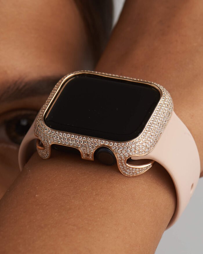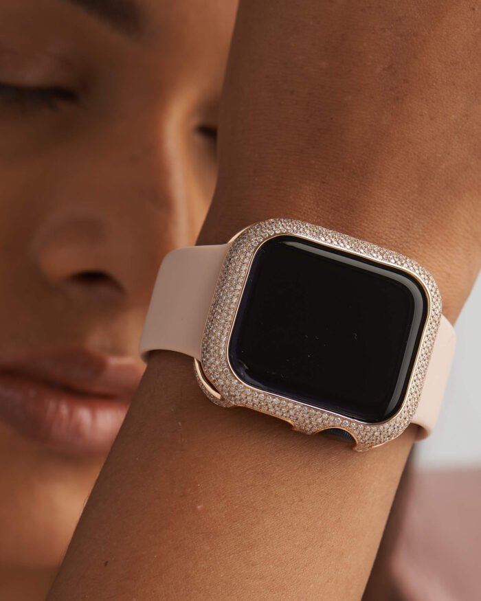 Glam up your feminine way with this shimmering case. This Bling Diamond Smart Watch case is made of solid gold and pave set diamonds that adorn the case completely. Simply clip the watch case to your smart watch.
