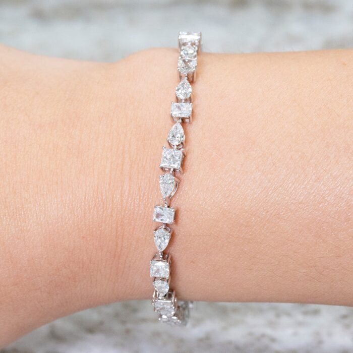 The 14K Gold Lab Grown Multi Shape Bracelet is a masterful blend of luxury, elegance, and sustainability, featuring an impressive total of 8.06 carats of lab-grown diamonds. This bracelet beautifully showcases 4.55 carats of pear-shaped diamonds alongside 3.51 carats of radiant cushion cut diamonds, creating a stunning visual interplay of shapes and brilliance.