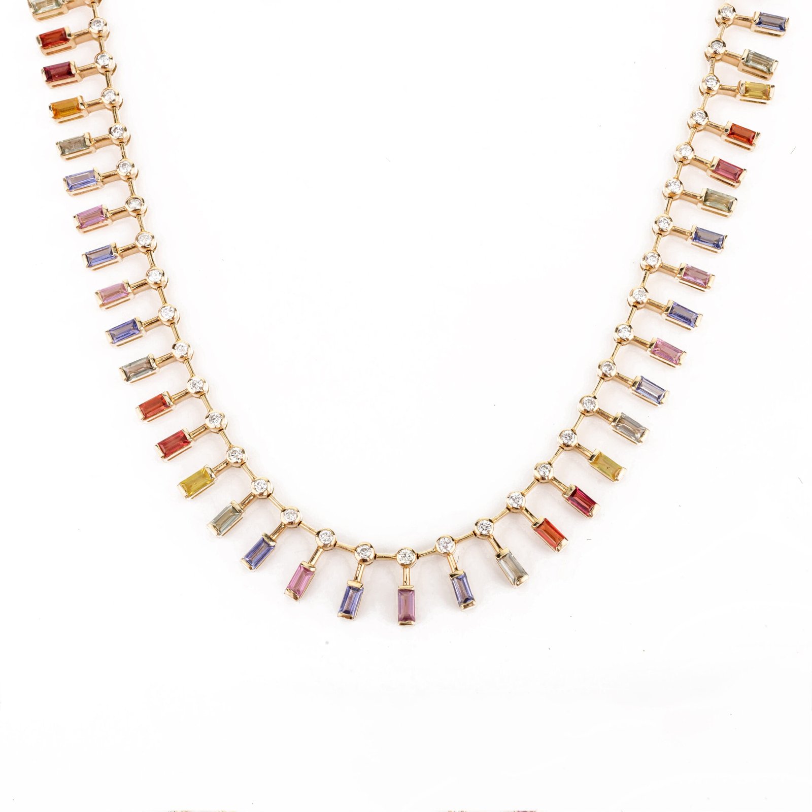 The 14K Solid Gold Multi Sapphire Choker Necklace is a breathtaking piece that elegantly combines the vibrant allure of multi-colored sapphires with the timeless sparkle of diamonds. Crafted from 14K solid gold, this necklace features 55 exquisite baguette-cut sapphires, each measuring 5 x 2.2 mm, with a total gemstone weight of 8.04 carats. The rich array of colors in the sapphires is beautifully complemented by the warm tones of the yellow gold, creating a harmonious and captivating look.