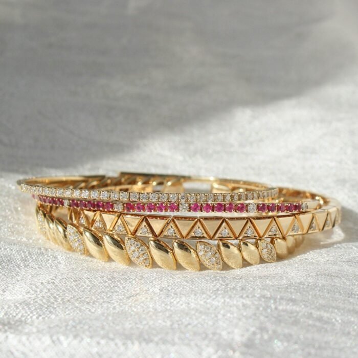 Crafted from high-quality 14KT gold, the bangle’s design highlights the clean lines and sharp angles of the triangle motif. Each diamond, with its VS1 clarity and F color, is carefully set to enhance its brilliance and provide a clear, radiant sparkle against the warm gold backdrop. The geometric arrangement of the diamonds adds a touch of contemporary elegance, making this bangle a standout accessory.