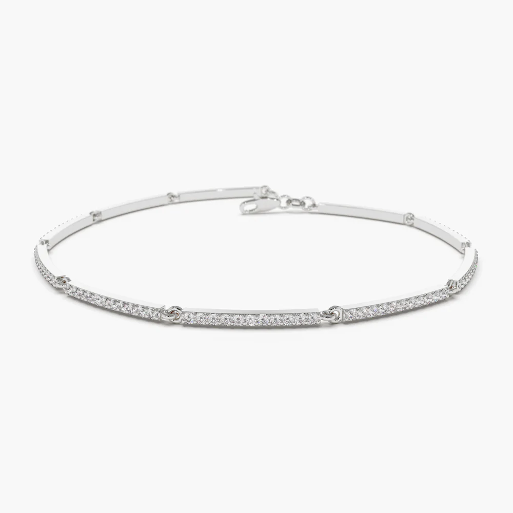 Dainty 14K gold bar bracelet with 110 GIA-certified natural diamonds (0.60 ct, G/SI) in a 15 mm micro-pavé setting. Available in White, Rose, and Yellow Gold. BIS Hallmarked.