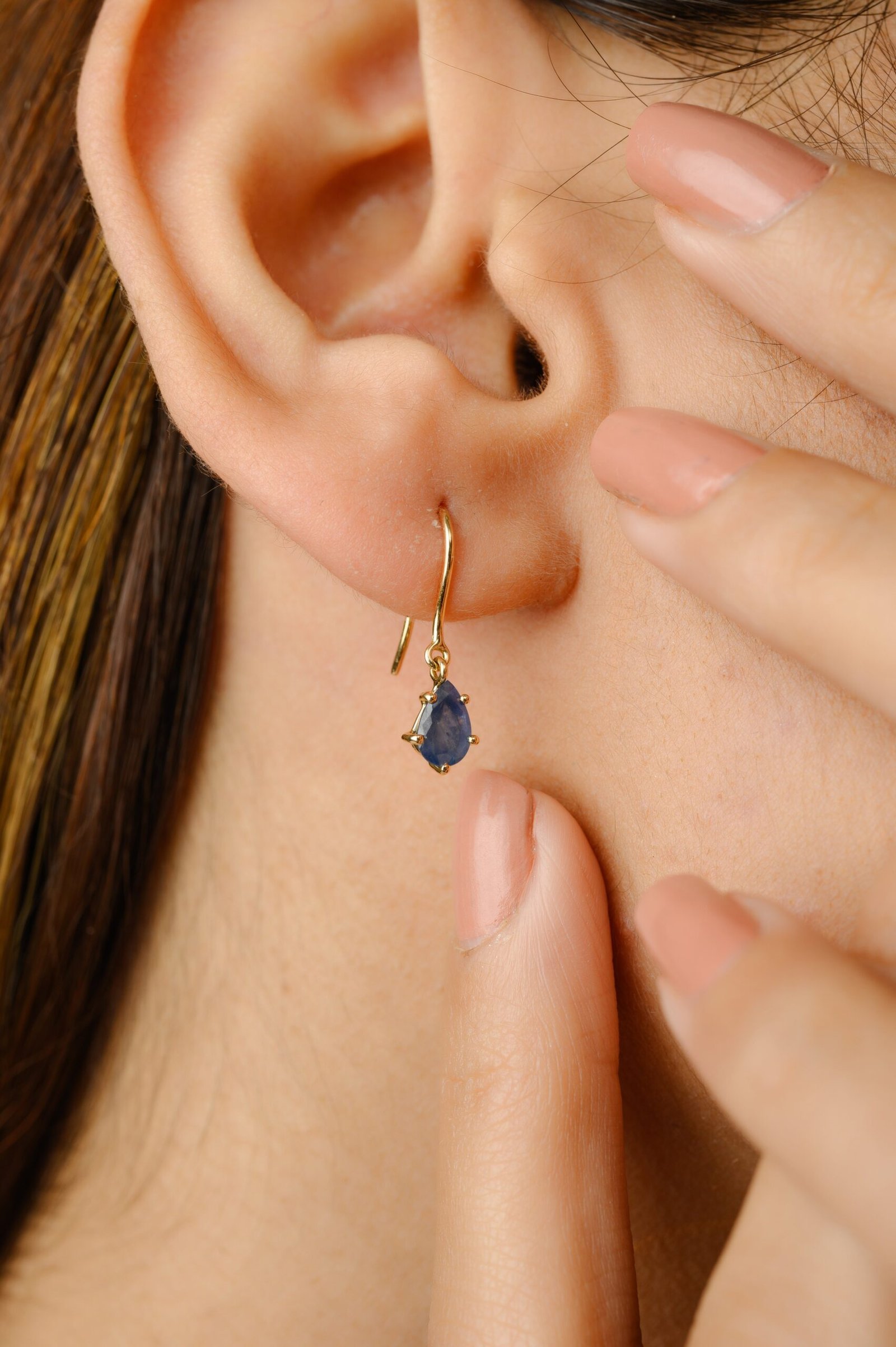 14K Solid Gold Pear Cut Blue Sapphire Dangle Tiny Earrings