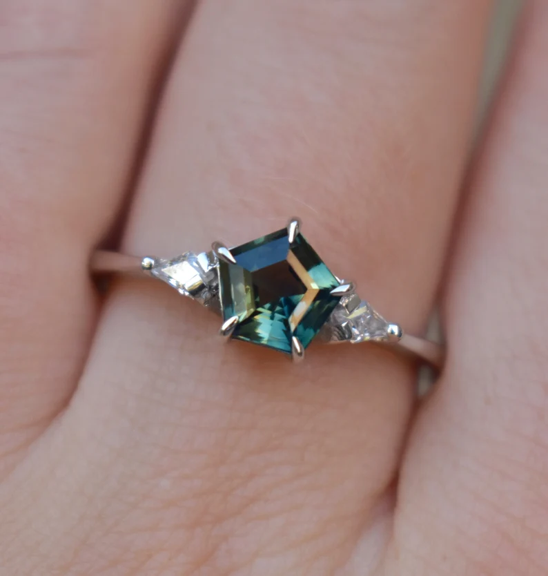 A mesmerizing fusion of nature’s beauty and modern elegance, this 14K gold pentagon parti sapphire ring with moissanites is a true statement piece. At its heart lies a stunning natural pentagon-shaped parti sapphire (approx. 1.2-1.3 ct), known for its unique color zoning and captivating brilliance. The sapphire’s mesmerizing blend of hues makes each ring one of a kind, ensuring that no two pieces are alike.