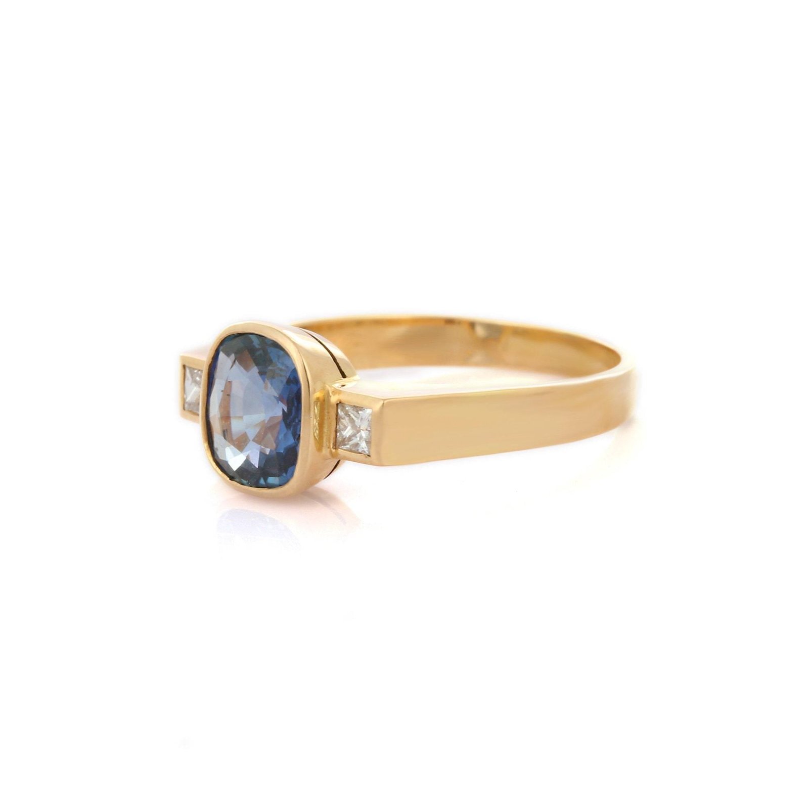 Celebrate everlasting love with our 14K solid yellow gold wedding ring featuring a stunning 1.85 ct oval blue sapphire and two sparkling diamonds totaling 0.12 ct. Set in secure bezel settings, this ring, weighing 4.459 grams, combines timeless elegance with symbolic significance.