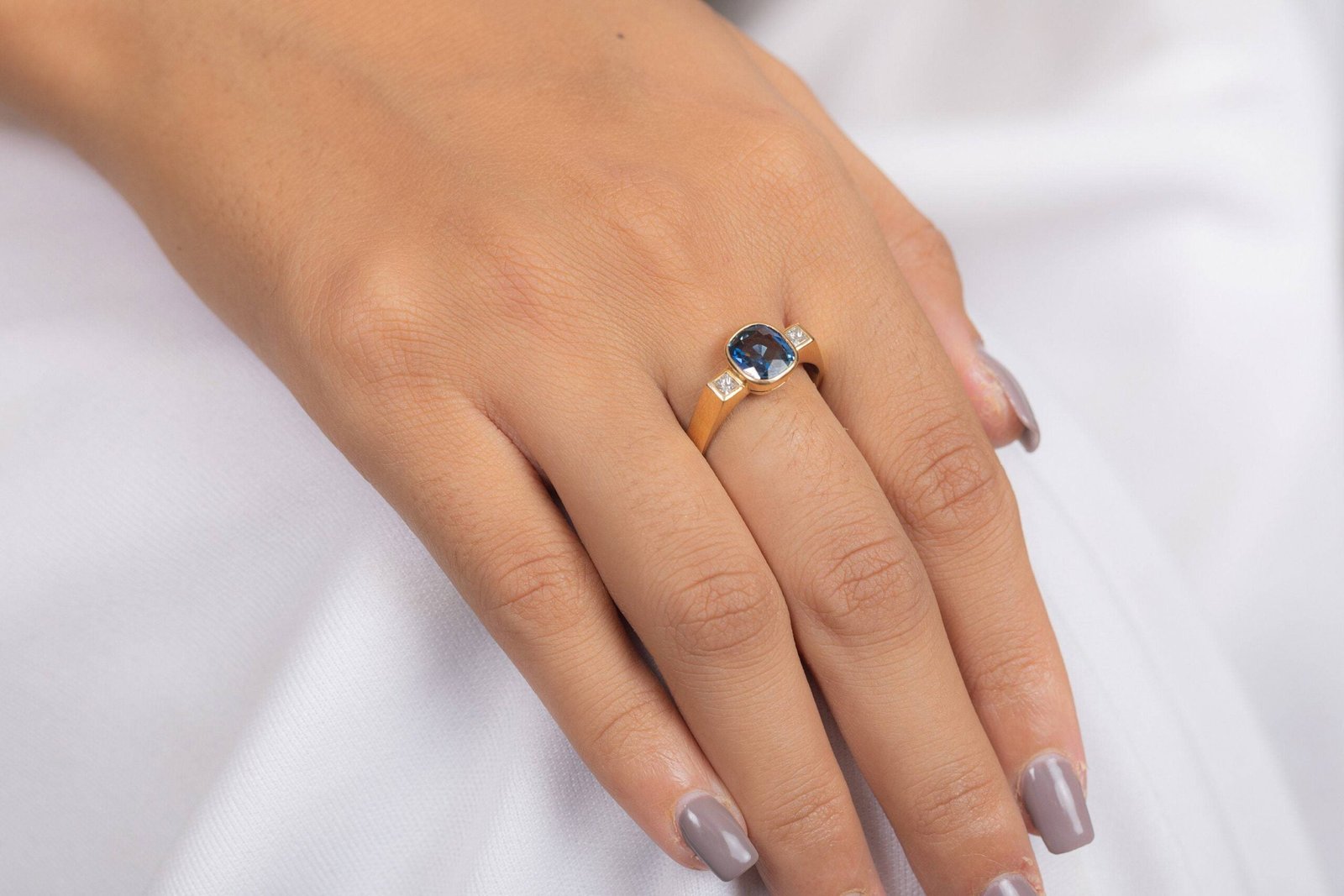 Flanking the sapphire are two brilliant round diamonds, totaling 0.12 ct. These diamonds are securely set in bezel settings, which not only protect the stones but also enhance their brilliance, ensuring they catch the light from every angle.