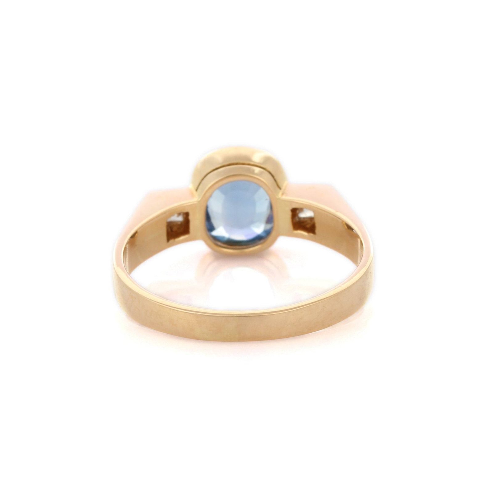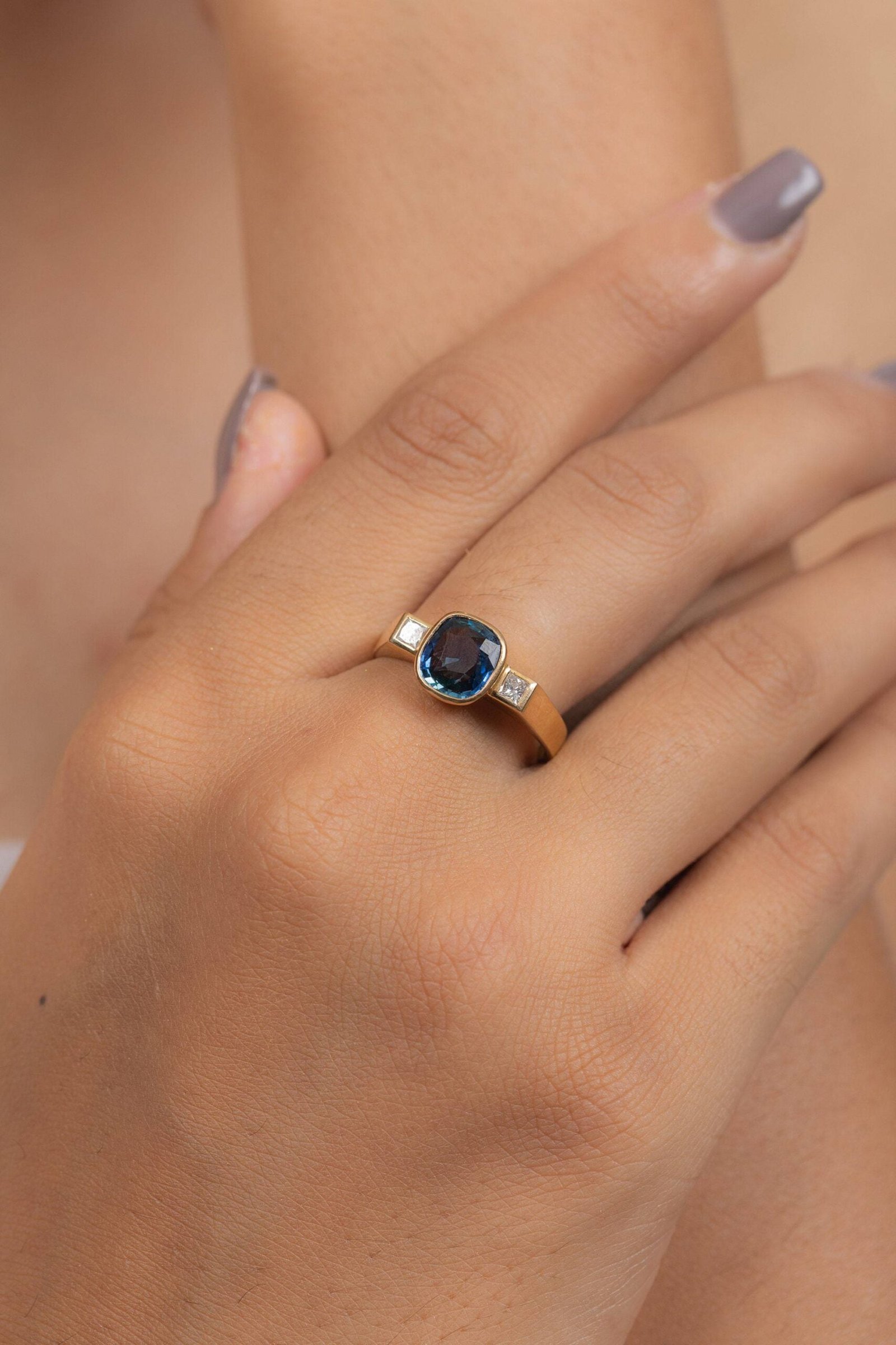 Weighing 4.459 grams, this ring offers a substantial feel on the finger while remaining comfortable for everyday wear. The solid yellow gold band adds warmth and richness to the design, complementing the vivid blue of the sapphire and the sparkle of the diamonds.