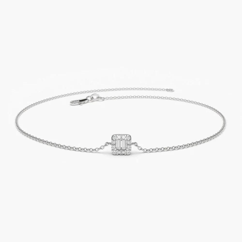 14K Solid Gold Tiny Baguette and Round Lab-Grown Diamond Station Bracelet