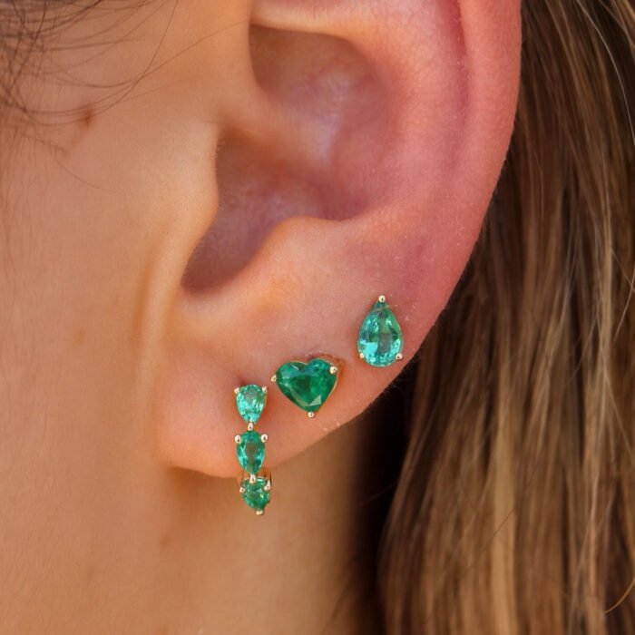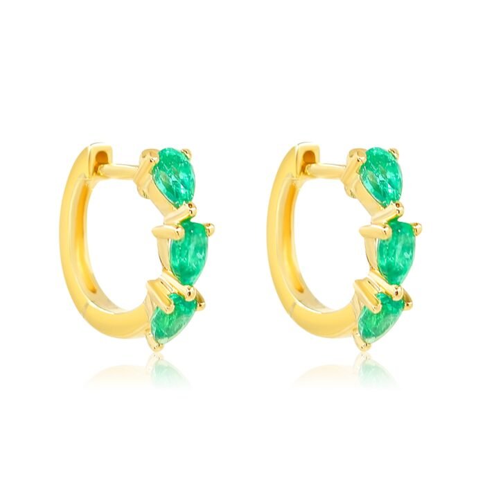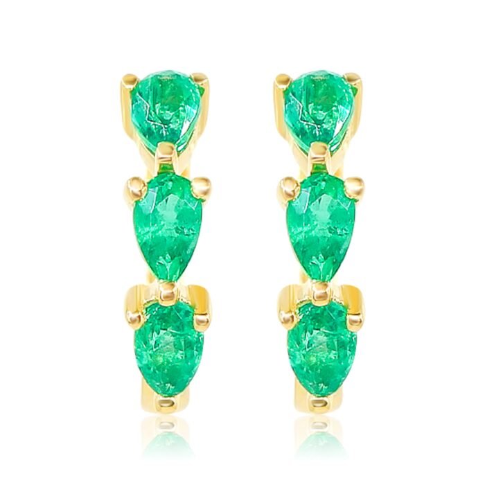 Elegant 14K solid gold hoop earring featuring three pear-shaped emeralds—crafted for timeless charm, rich green brilliance, and graceful style.