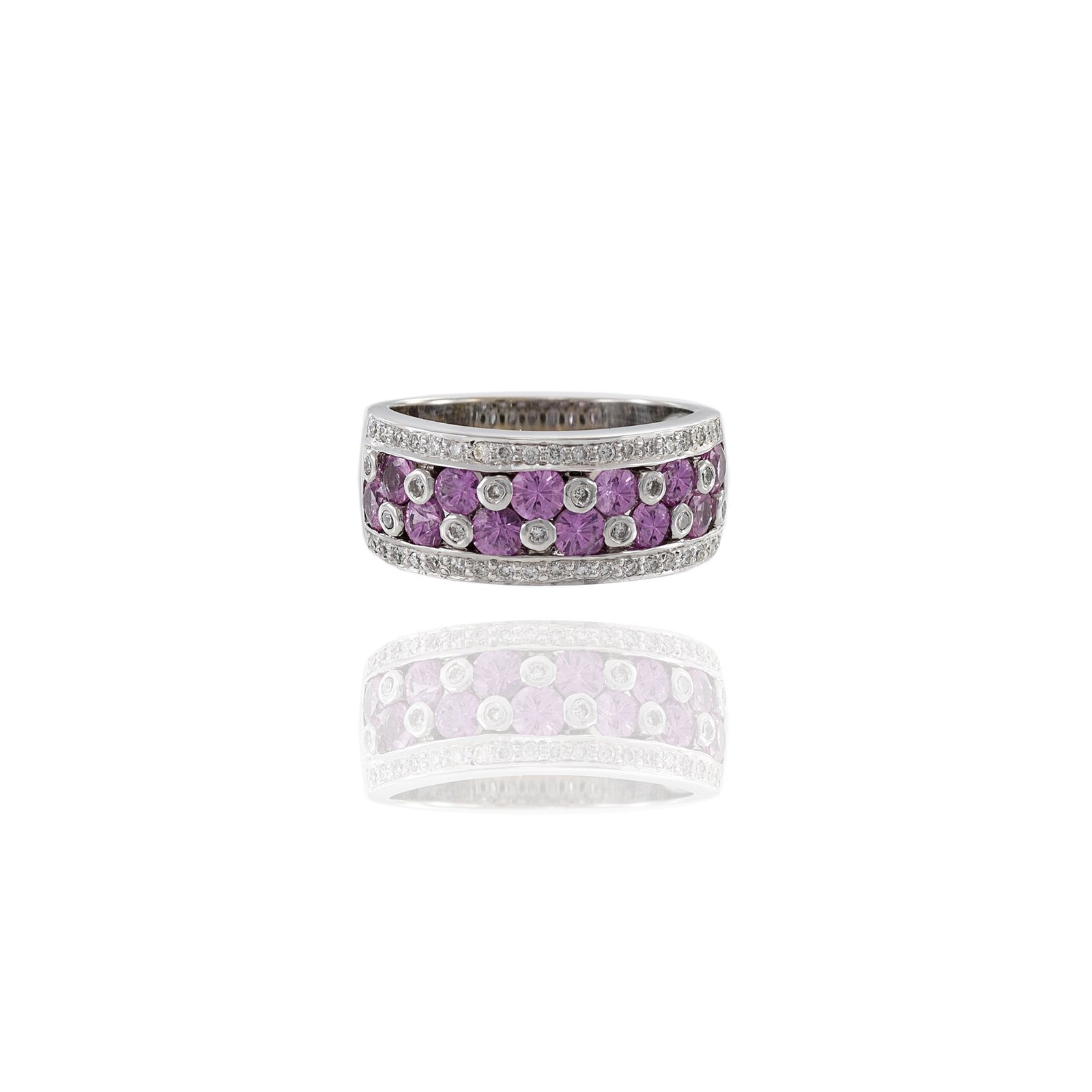 14K gold eternity band featuring 0.44ct pink sapphires and 0.24ct diamonds. A vibrant and romantic fine jewelry piece.
