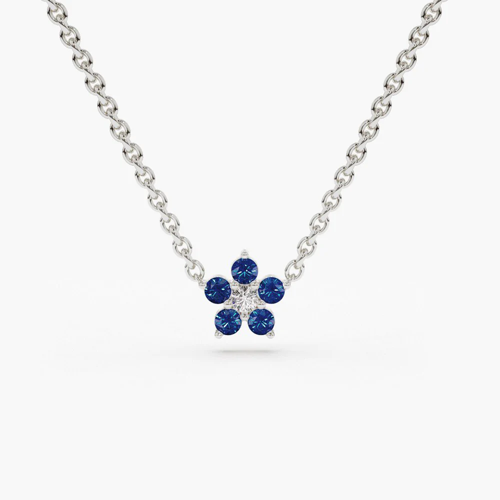 14K Solid Gold Sapphire and Diamond Flower Charm Necklace