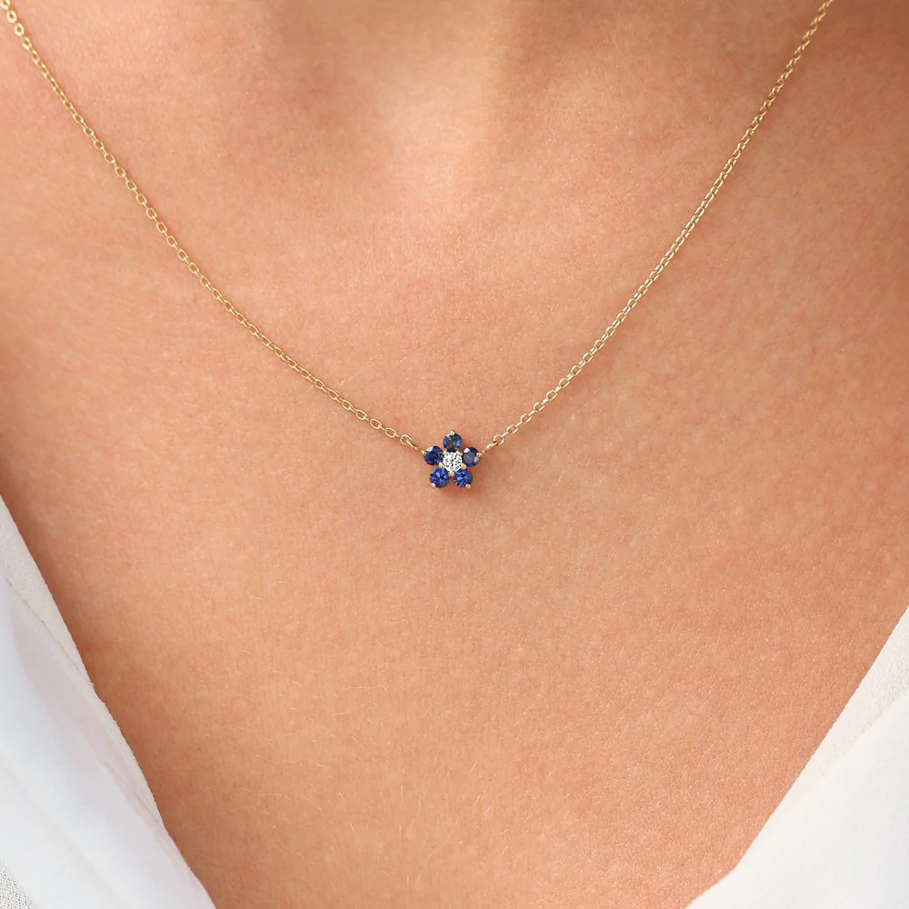 Charming 14K solid gold necklace featuring a sapphire and diamond flower charm—crafted for delicate elegance and timeless floral beauty.