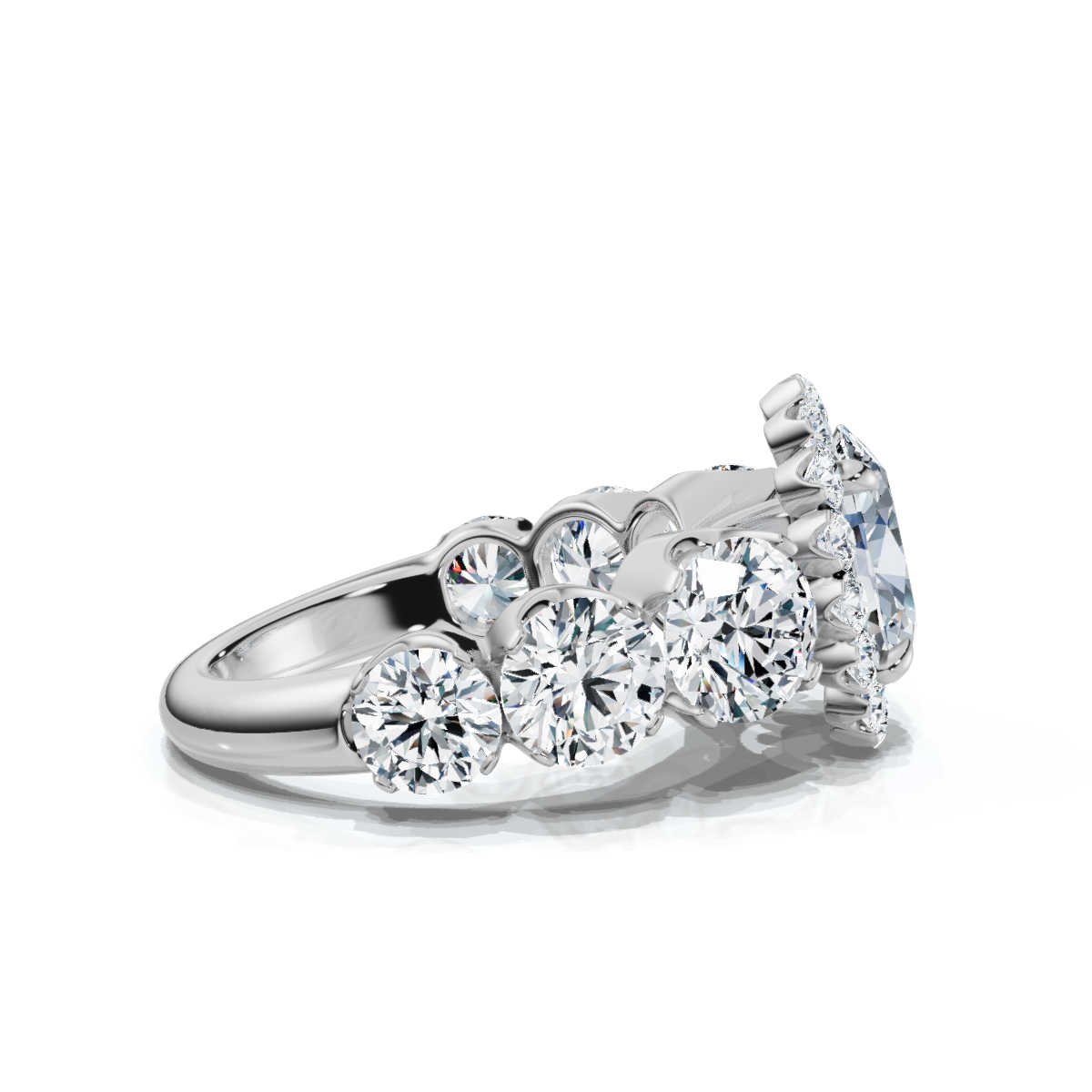 Surrounding the center diamond is a halo of round lab-grown diamonds, totaling 3.51ct, which enhances the central stone’s beauty. These 21 side diamonds, all with F color and VS2 clarity, amplify the sparkle and create a captivating effect, making this ring a true showstopper.
