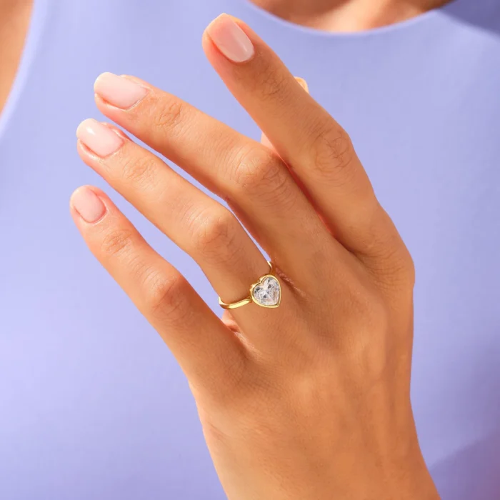 This 14K solid gold engagement ring features a heart-shaped moissanite diamond in a secure bezel setting—offering sweet elegance and radiant charm.