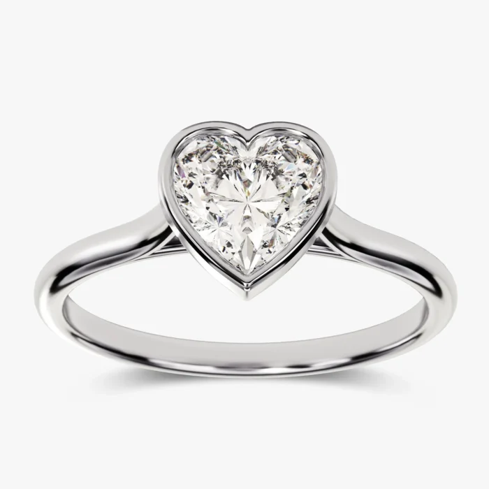 The design focuses on simplicity and elegance, allowing the unique heart shape and the quality of the moissanite to take center stage. The bezel setting offers a modern touch to this classic engagement ring style, making it perfect for those who cherish unique design elements combined with traditional sensibilities.