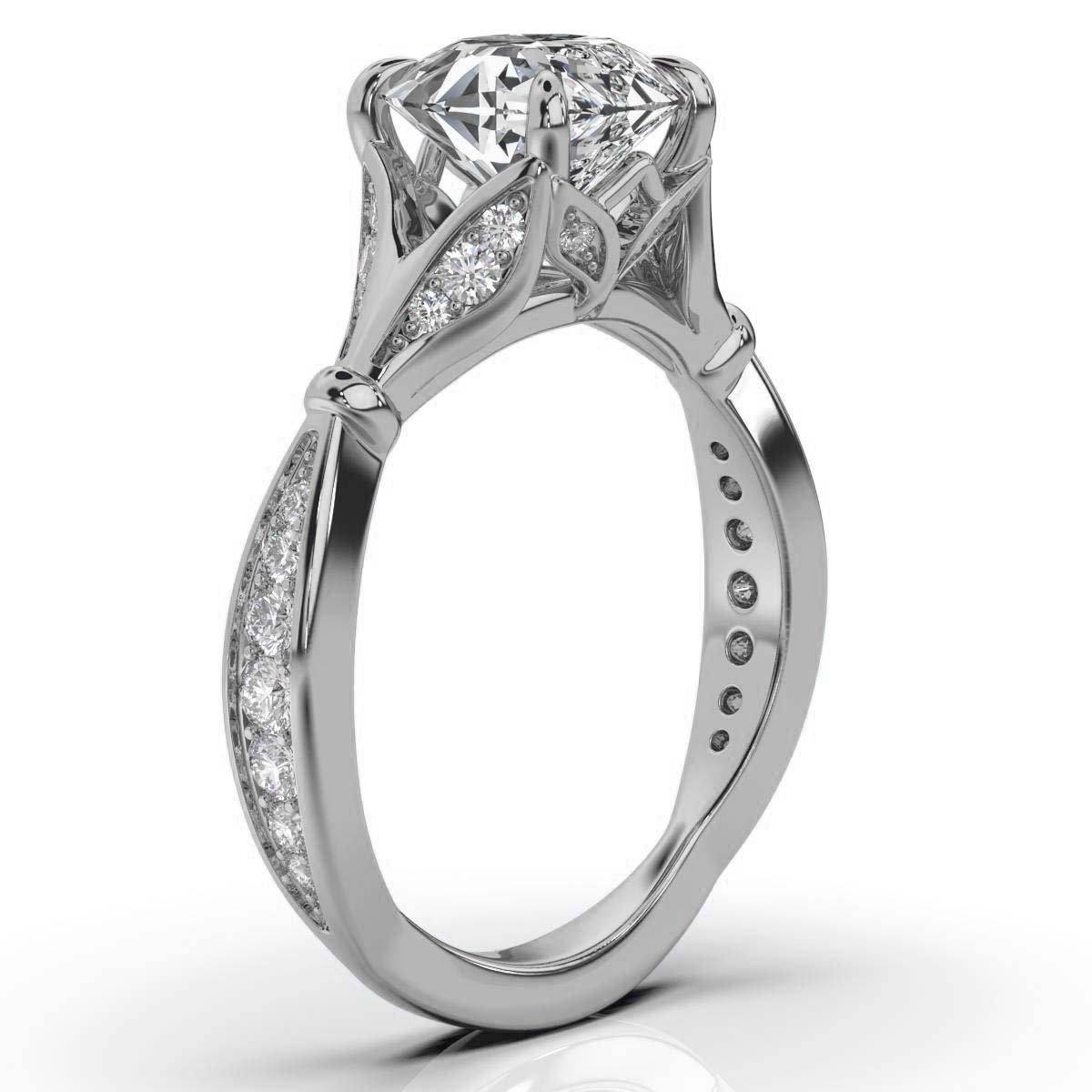 Surrounding the centerpiece, 30 round Moissanite diamonds with a total weight of 0.37 carats add a mesmerizing accent, enhancing the brilliance of the design. The prong setting ensures maximum light reflection, creating an eye-catching shimmer from every angle.