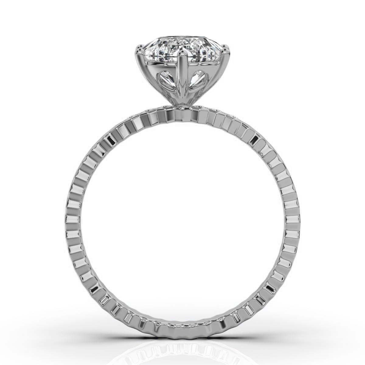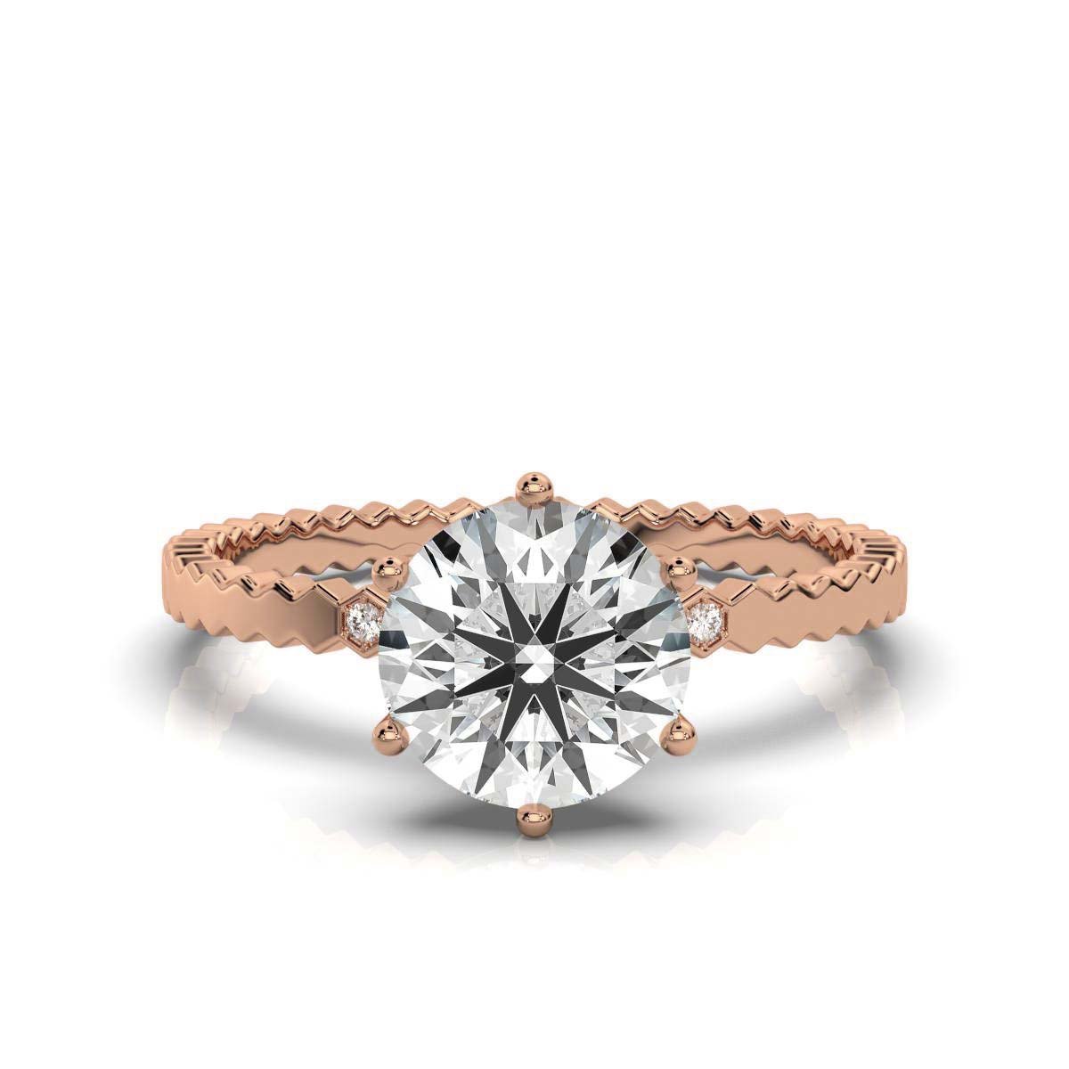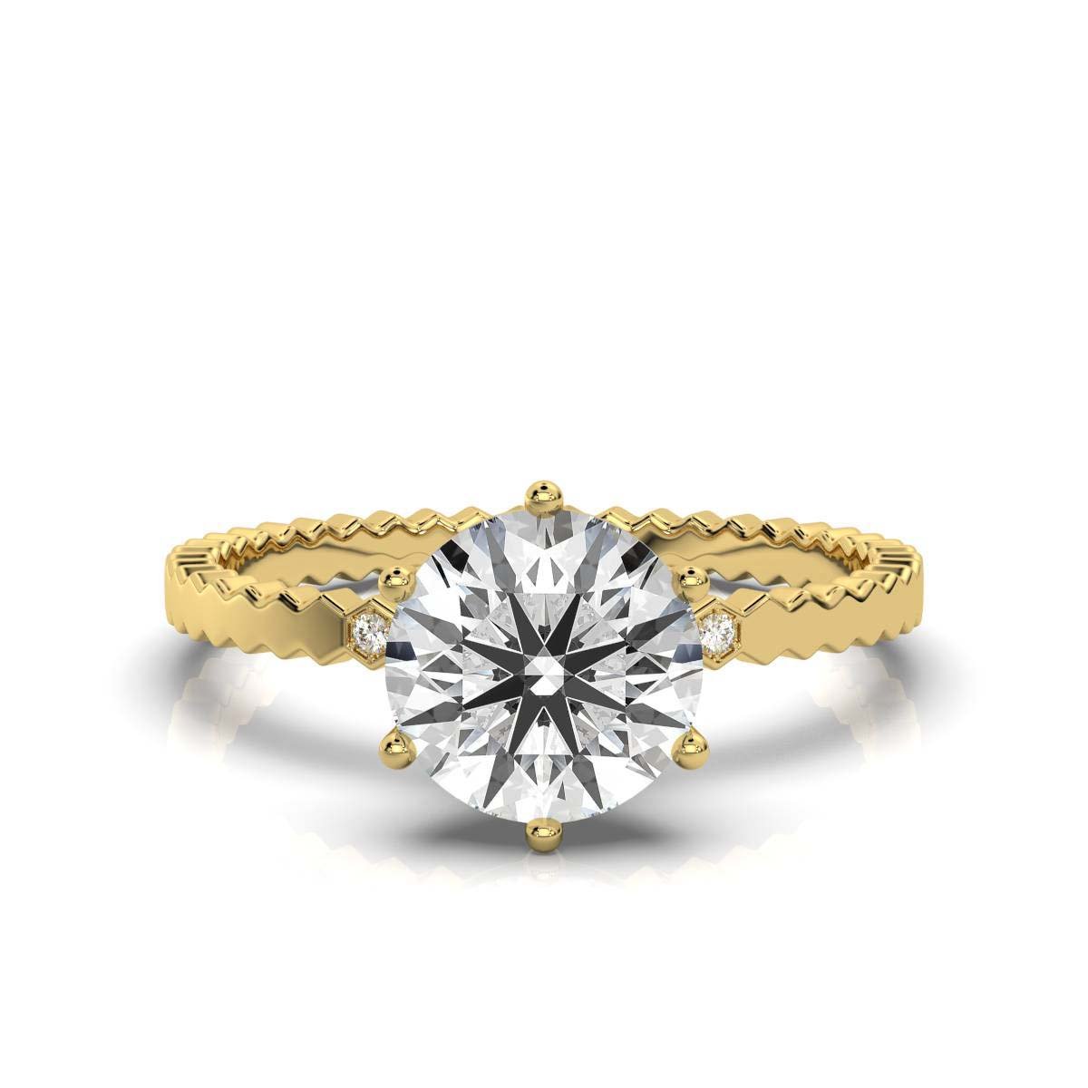 A 2 ct round moissanite diamond ring with 6 side diamonds (0.03 ct total) in a sleek bezel setting. Crafted in 14K solid gold, available in white, yellow, and rose gold.