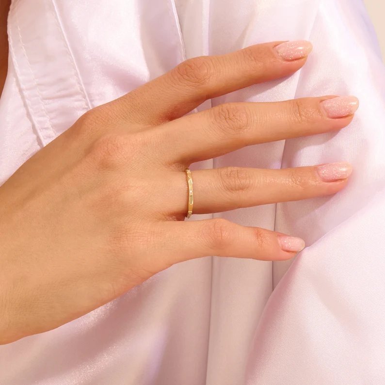 Elevate your everyday elegance with this 14k Solid Gold Slim Wedding Ring, a delicate stacking band designed for timeless beauty. Crafted from high-quality 14K solid gold, available in White, Rose, and Yellow Gold, this ring features a slim profile that fits comfortably and looks effortlessly chic when worn alone or stacked with other bands.