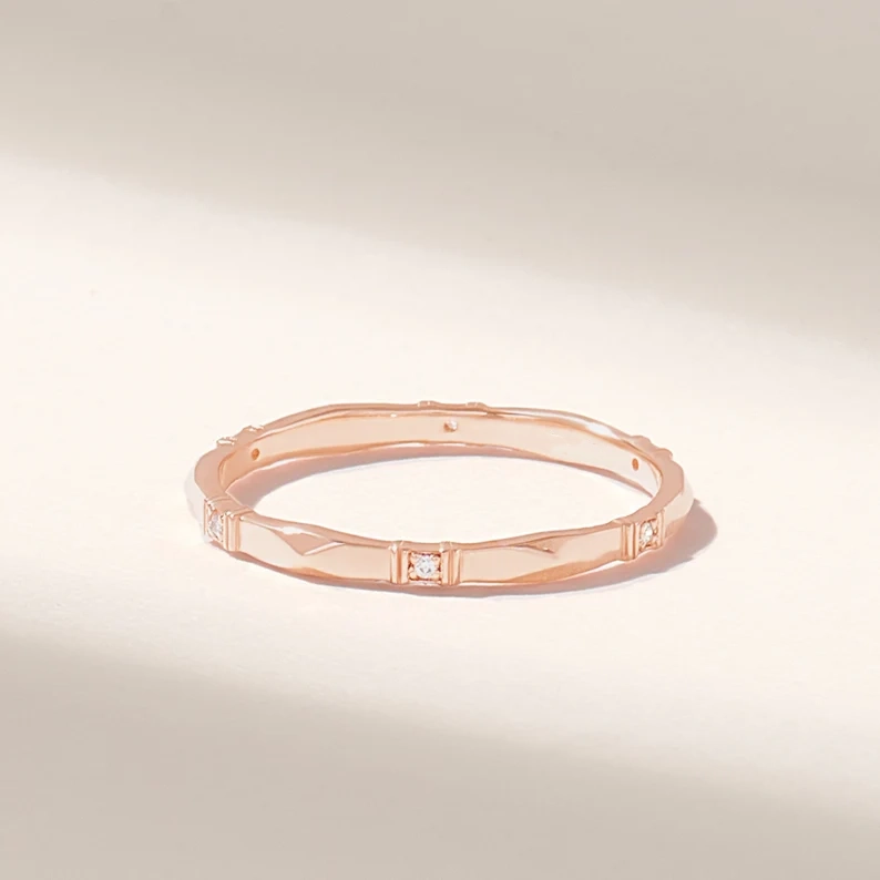 14k Solid Gold Slim Wedding Ring: Real Natural Diamond Delicate Stacking Band