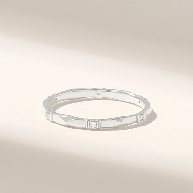 Measuring a narrow 1.65 mm width and 1.10 mm thickness, with a slightly wider top at 2.00 mm, the band is adorned with real natural diamonds totaling 0.02 ctw. Each diamond is carefully selected for GH color and VS-SI clarity, ensuring subtle brilliance and shimmer.