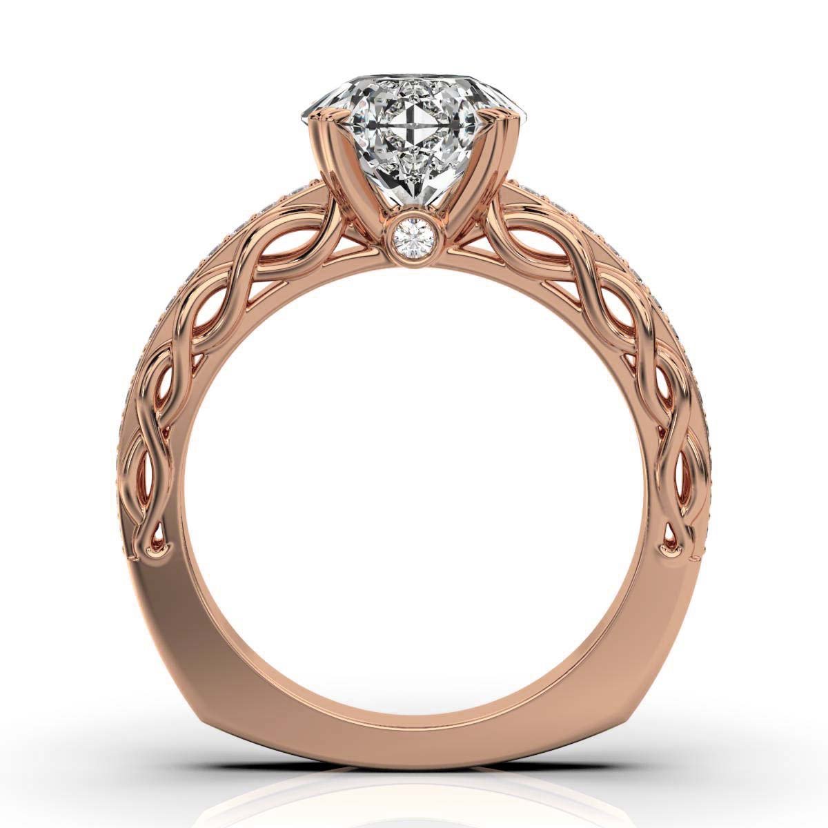 Accentuating the beauty of the centerpiece, 28 meticulously set Moissanite side stones (0.26 ctw) enhance the band with extra brilliance. Their precise placement ensures a harmonious balance between elegance and radiance, making this ring a timeless symbol of love and commitment.