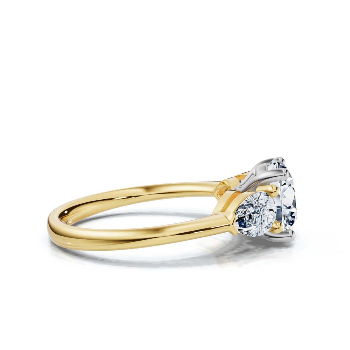 This 14K solid gold engagement ring features a round center moissanite flanked by pear-shaped stones—blending elegance, brilliance, and meaningful charm.