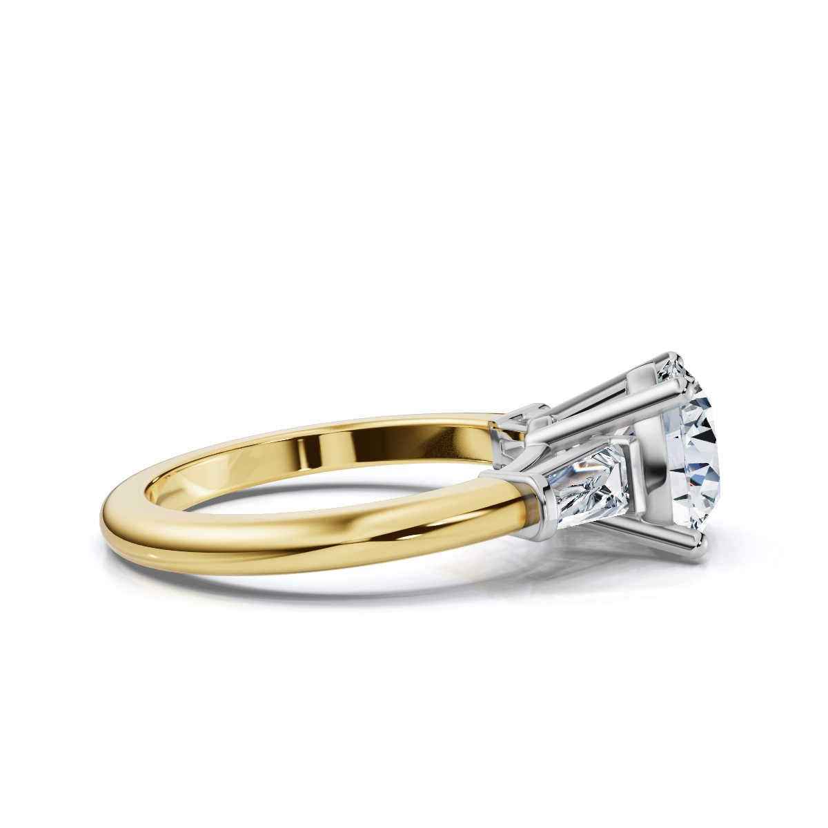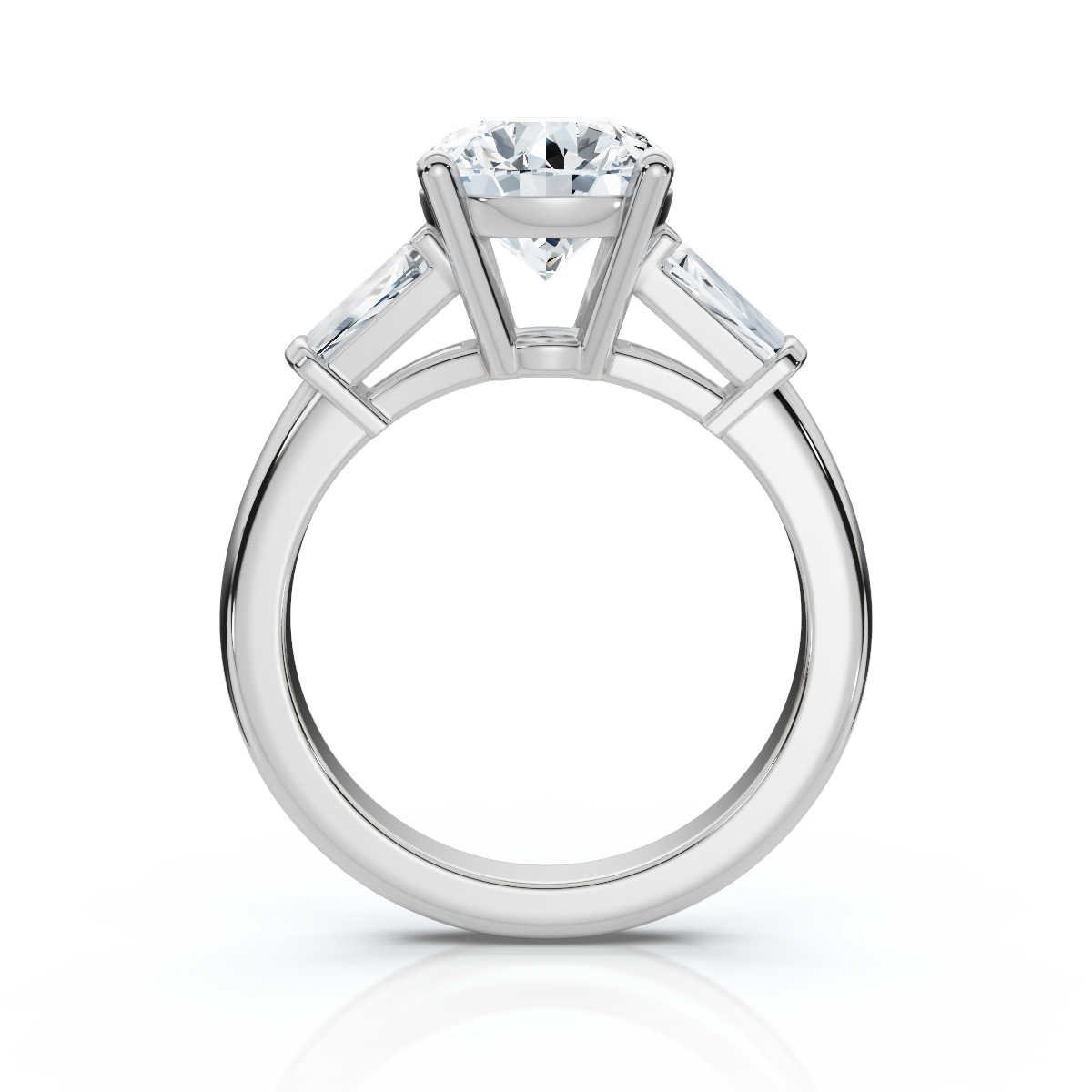 Enhancing the beauty of the centerpiece are two tapered baguette-cut moissanite side stones with a combined weight of 0.5 carats. The sleek, elongated shape of the baguette stones adds a touch of sophistication and a modern edge to the classic three-stone design. Each stone is securely set in prongs, ensuring durability and longevity.
