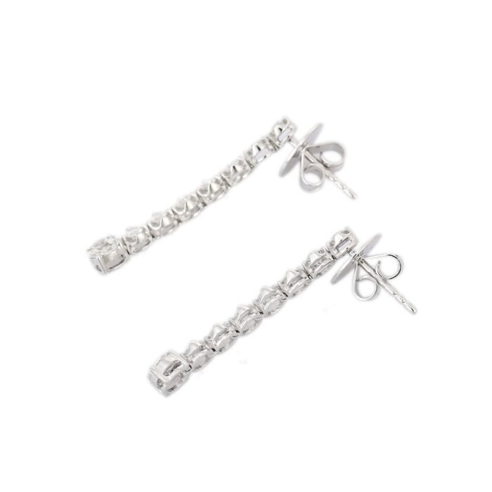 The dangle design adds movement and allure, creating a sophisticated look that enhances any outfit. Each diamond is meticulously set to maximize its sparkle and brilliance, ensuring a captivating display of light with every turn of your head.