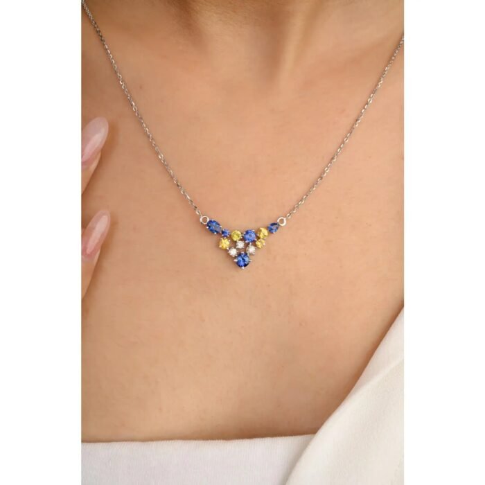 Add a touch of colorful sophistication to your ensemble with this 14K Solid Gold Multi Sapphire Necklace. Crafted from high-quality white gold, this necklace features a harmonious blend of blue and yellow sapphires, accented by sparkling diamonds.
