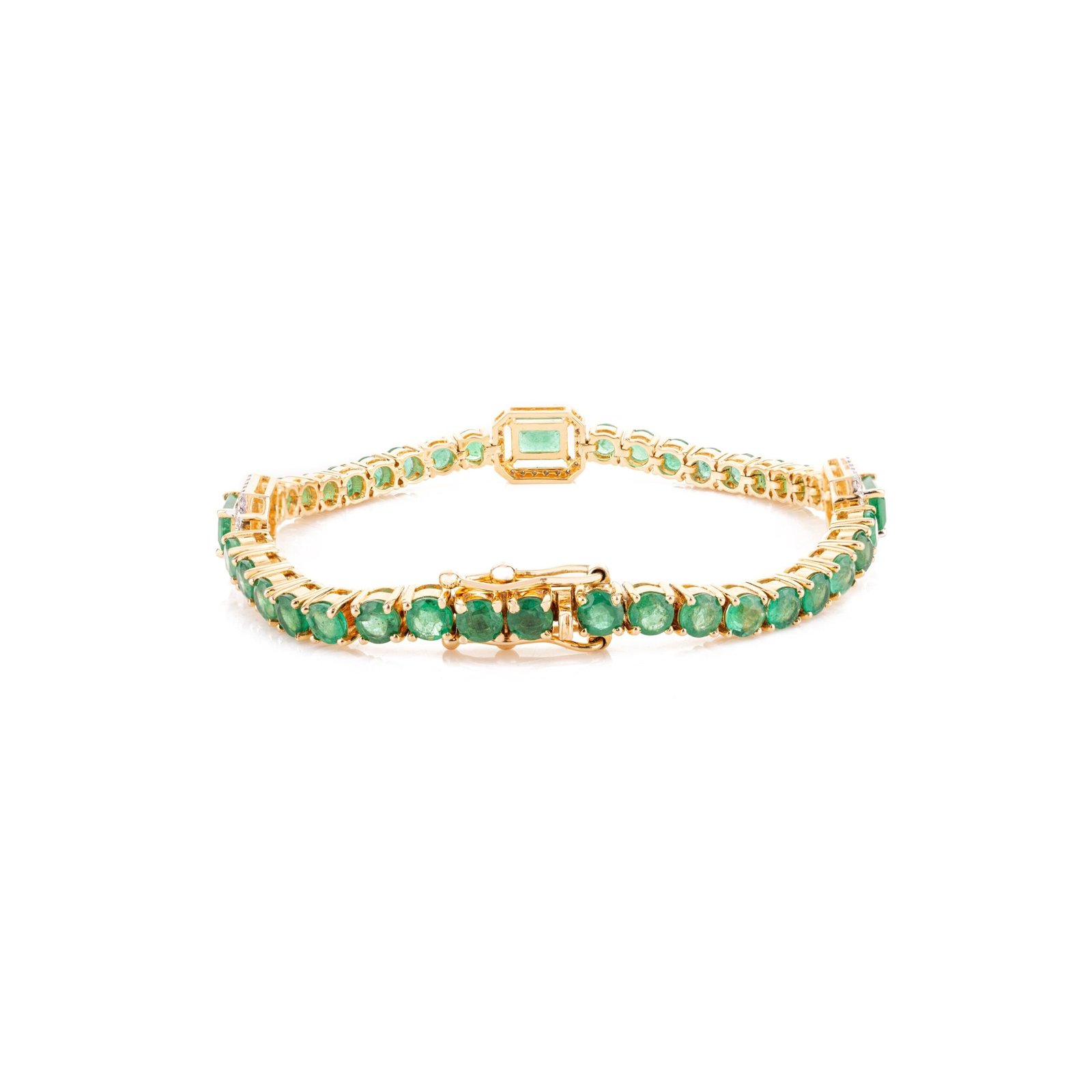 Elevate your wrist with the 14K Solid Gold Emerald Diamond Bracelet, adorned with 7.74 carats of emeralds and 0.43 carats of diamonds in a stunning yellow gold setting.