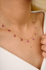 Elegant 14K solid gold necklace with vibrant ruby stations, adding a touch of timeless color and sophistication to any look.
