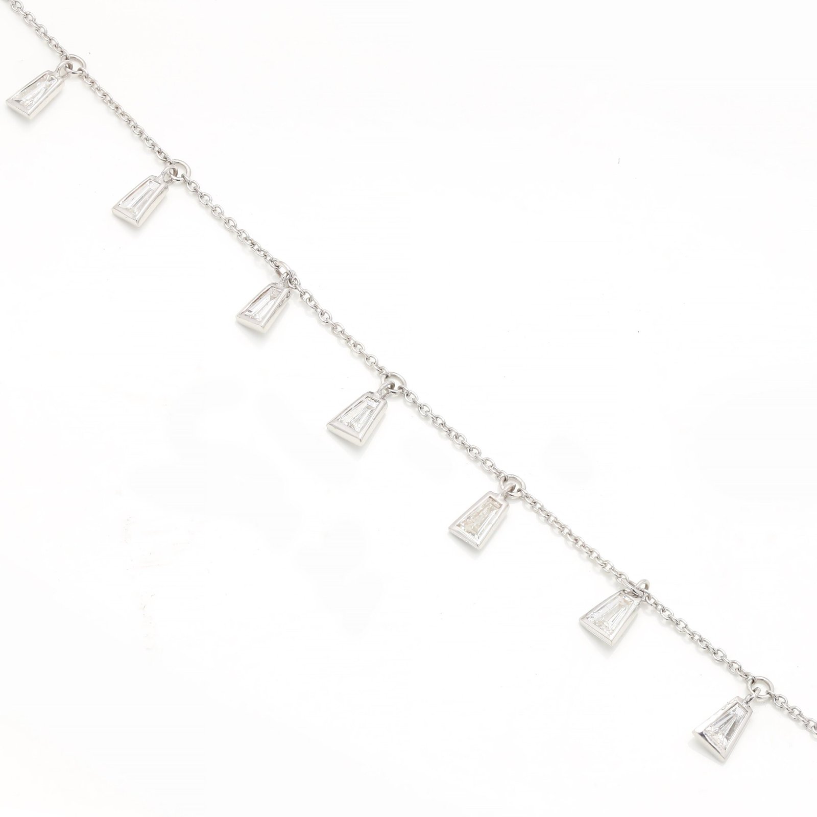 The 14K White Gold Diamond Bracelet features 12 baguette diamonds, totaling 0.94 carats, set in a sleek bezel setting. Crafted from 14K solid white gold and weighing 1.809 grams, this 7.5-inch adjustable bracelet offers a sophisticated touch of elegance.