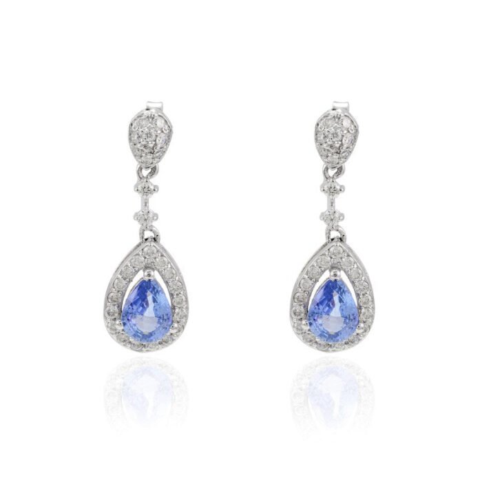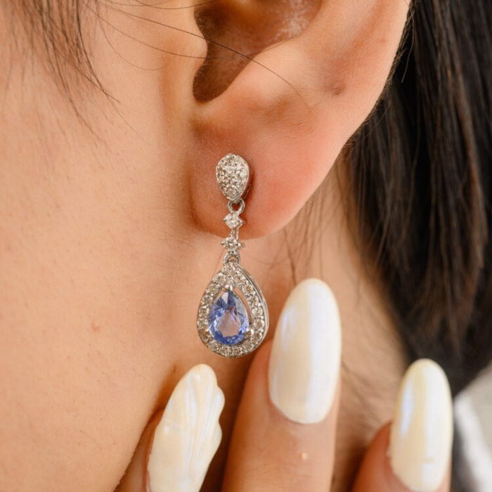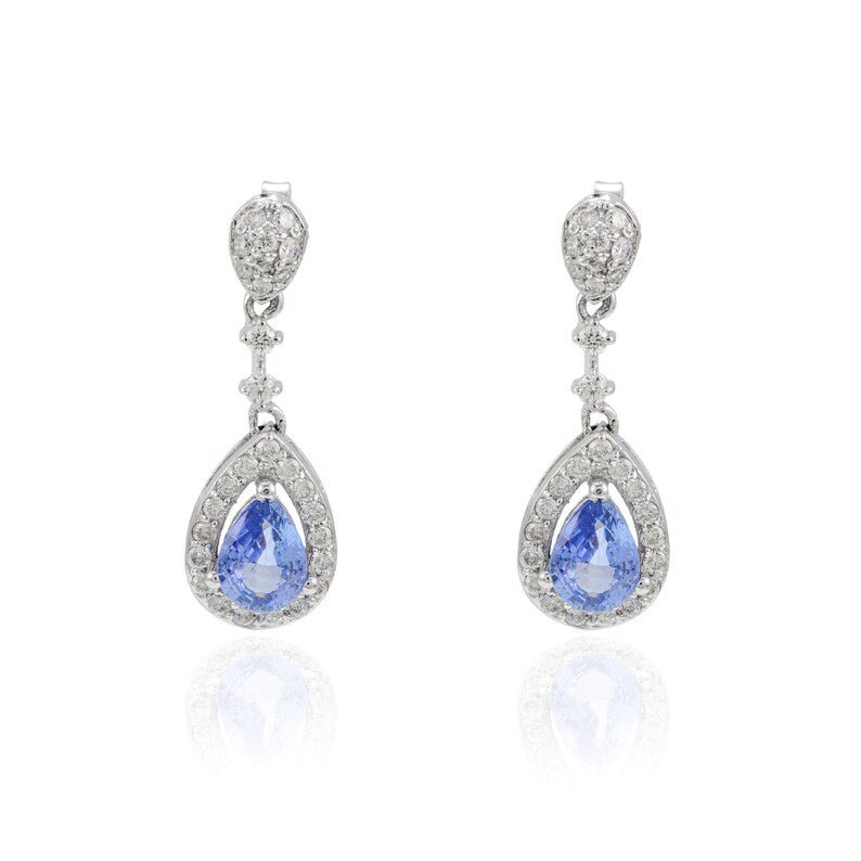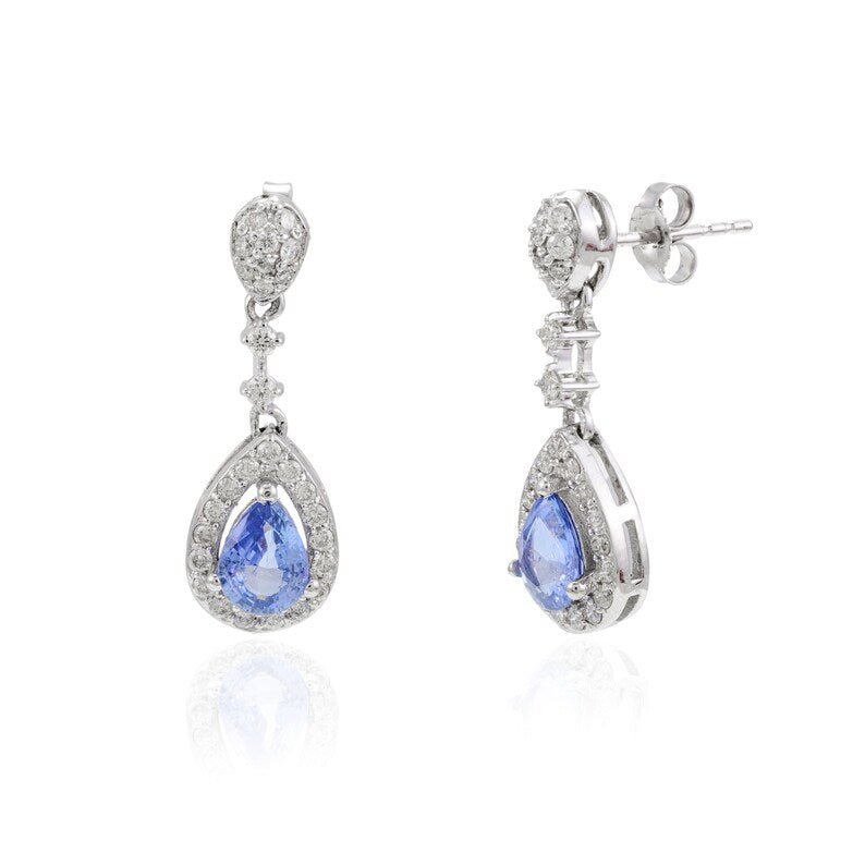 Enhancing the allure of these earrings are round diamonds, adding an additional 0.65 carats of brilliance. The diamonds are meticulously set to highlight their sparkle, making the earrings shine with every movement. The combination of blue sapphires and diamonds in a drop design creates an elegant and sophisticated effect, perfect for both everyday wear and special occasions.