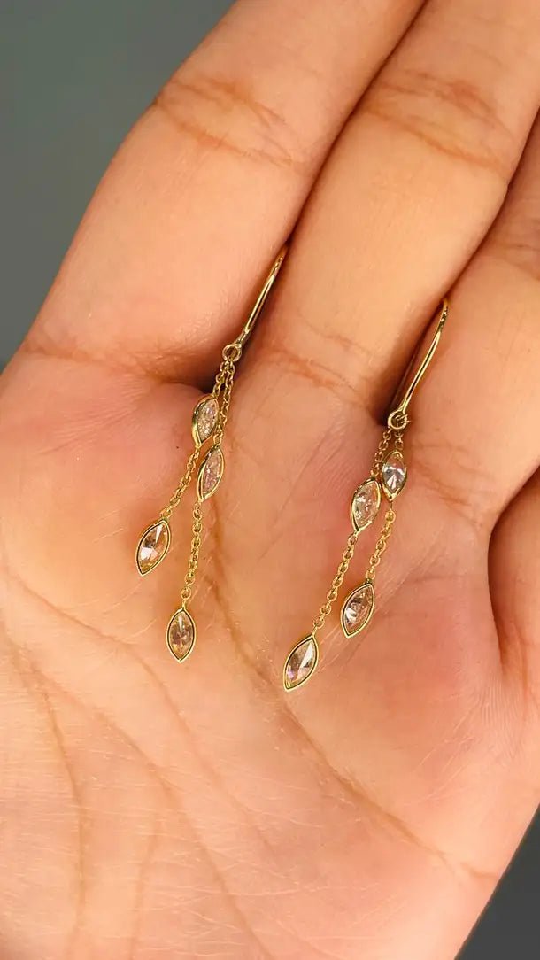 Crafted from 14K solid yellow gold, the earrings provide a luxurious and warm backdrop that complements the diamonds’ sparkle. The bezel setting securely holds each diamond while allowing their full brilliance to shine through. The layered chain design adds a dynamic and contemporary touch, creating an eye-catching effect that moves gracefully with every movement.