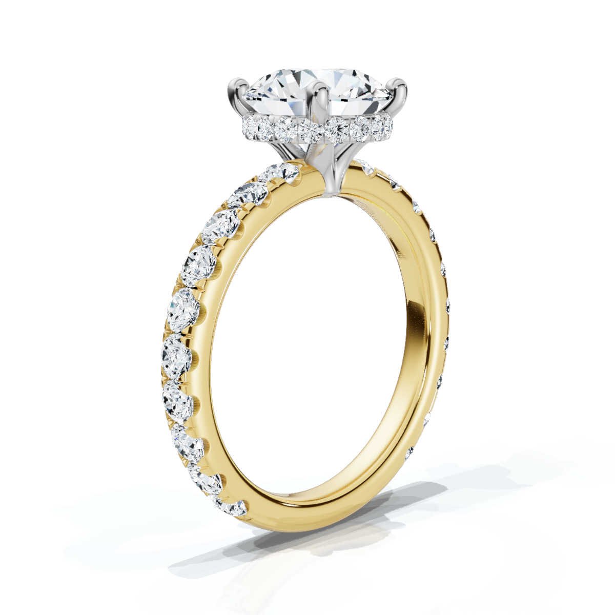 Enhancing the center stone, 38 meticulously placed round Moissanite side stones (0.96ct total) add extra depth and glamour, elevating the ring’s elegance. The timeless round-cut arrangement creates a seamless, luminous effect, making it the perfect choice for those who cherish classic yet striking designs.