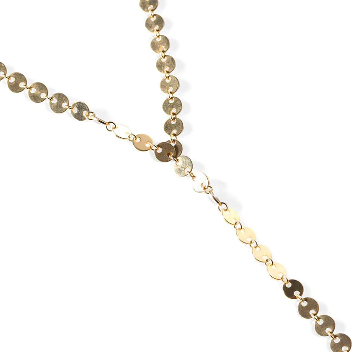 Diamond Disc Drop Necklace: Crafted from gleaming 14k gold, this exquisite necklace features a dainty chain adorned with a shimmering diamond disc pendant, adding sophisticated sparkle to any look.